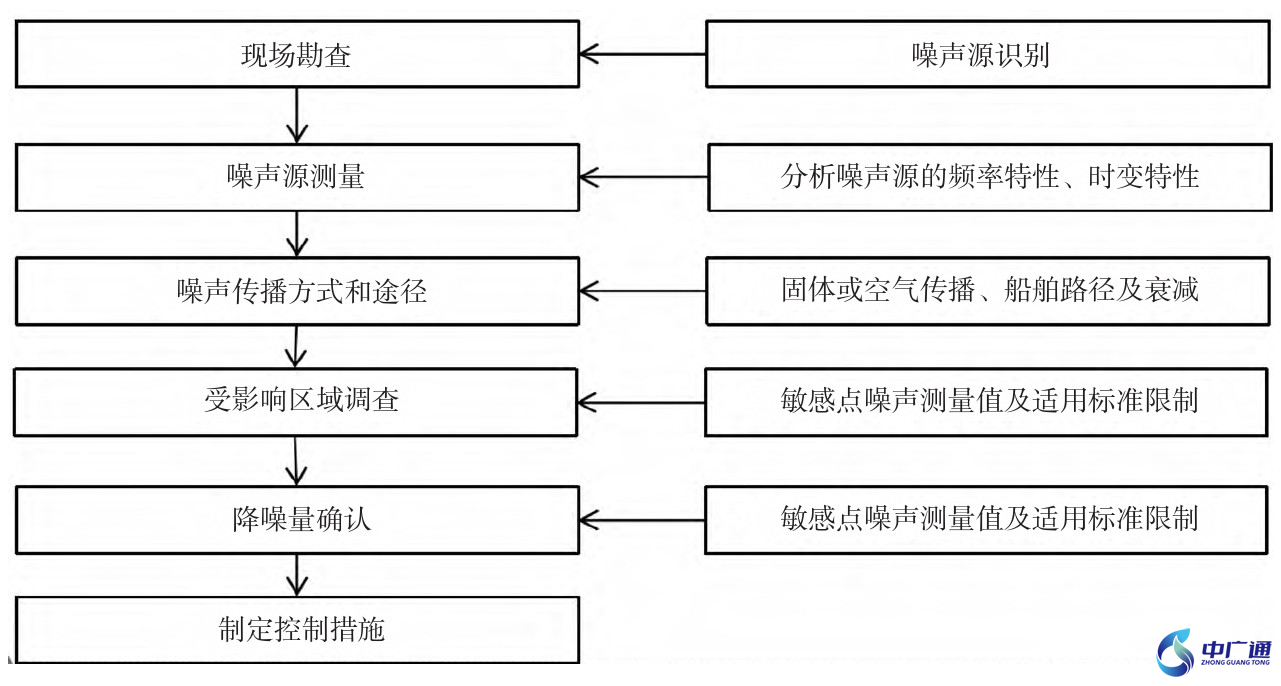 噪聲治理的總體思路如下:噪聲控制應(yīng)從聲源特性判定入手,經(jīng)過(guò)傳播途徑的分析、降噪量的確定等階段、確定最佳方案后對(duì)噪聲控制效果進(jìn)行評(píng)價(jià)。首先,通過(guò)對(duì)平臺(tái)的現(xiàn)場(chǎng)踏勘,識(shí)別主要噪聲源,并通過(guò)測(cè)量對(duì)其頻率特性及時(shí)變特性進(jìn)行分析。其次,根據(jù)現(xiàn)場(chǎng)情況,確定噪聲傳播方式和路徑,確定主要受影響區(qū)域,也就是噪聲敏感點(diǎn)處各噪聲源的影響程度。最后,對(duì)比敏感點(diǎn)噪聲值與標(biāo)準(zhǔn)限值,確定降噪量,進(jìn)而確定合適的噪聲治理方案,從圖1可以看出分析的階段及要素。