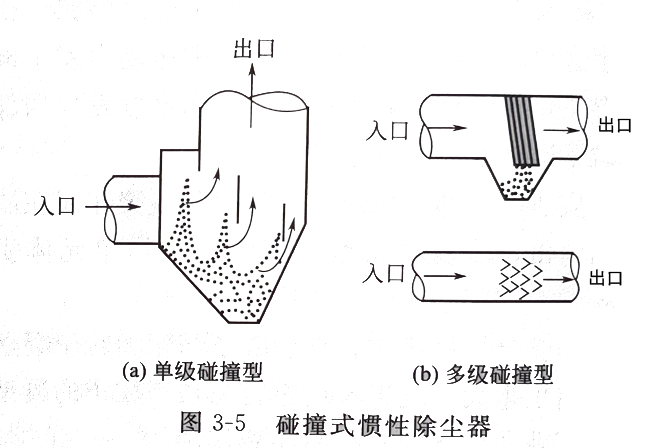利用粉塵與氣體在運動中的慣性力不同,使粉塵從氣流中分離出來。在實際應(yīng)用中實現(xiàn)慣性分離的一般方法是使含塵氣流沖擊在擋板上,使氣流方向發(fā)生急劇改變,氣流中的塵粒慣性較大,不能隨氣流急劇轉(zhuǎn)彎,便從氣流中分離出來。在慣性除塵方法中,除利用了粒子在運動中的慣性較大外,還利用了粒子的重力和離心力。
